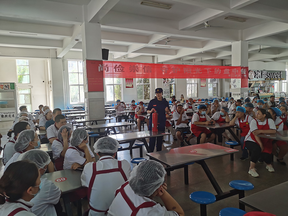 开展消防培训演练,保障消防安全。6月22日,后勤服务处联合安全保卫处,邀请烟台高新区消防大队为我校食堂开展消防培训,现场演练灭火器、灭火毯、消防栓等消防设施的使用,并以餐厅为单位开展火灾现场疏散演练,全面提升了餐厅从业人员消防“四个能力”,切实提高了我校食堂突发火灾事故的应对能力。