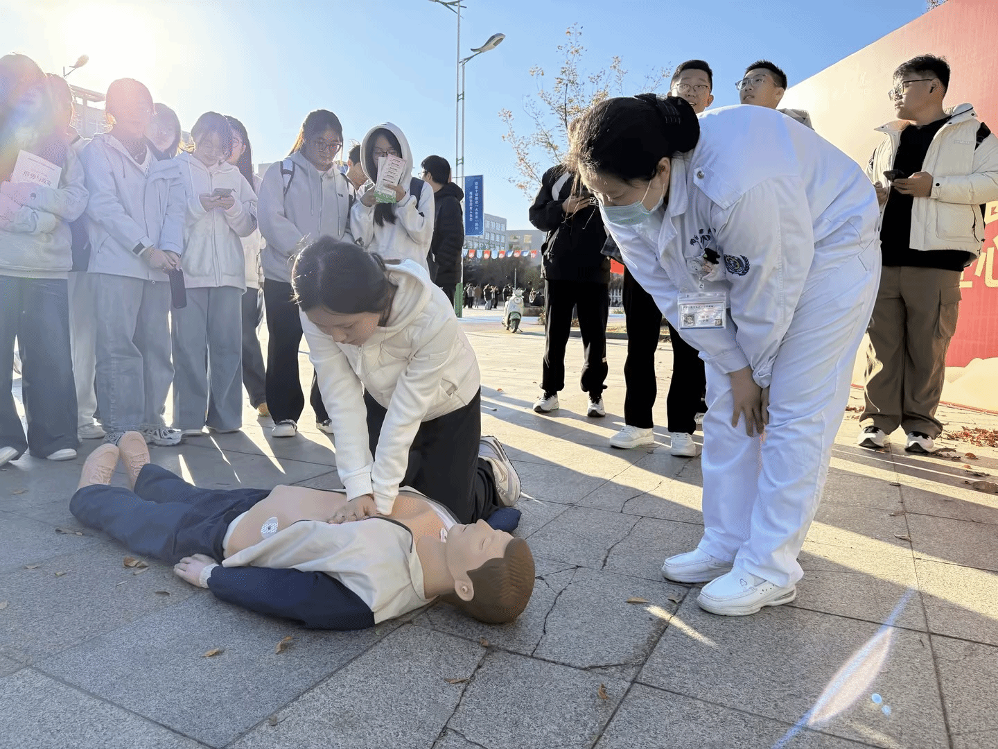 急救技能实操教学也成为本次活动的一大亮点。医护人员借助模拟人演示,详细讲解心肺复苏(CPR)和海姆立克急救法的操作要领、动作规范与注意事项,通过“演示+实操”的方式,指导师生亲手实践,帮助大家在互动中快速掌握关键急救技能,提升应对突发健康事件的处置能力。