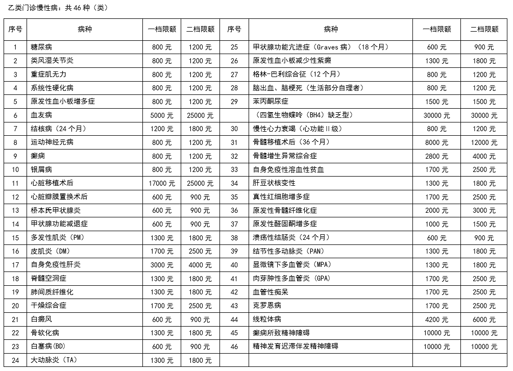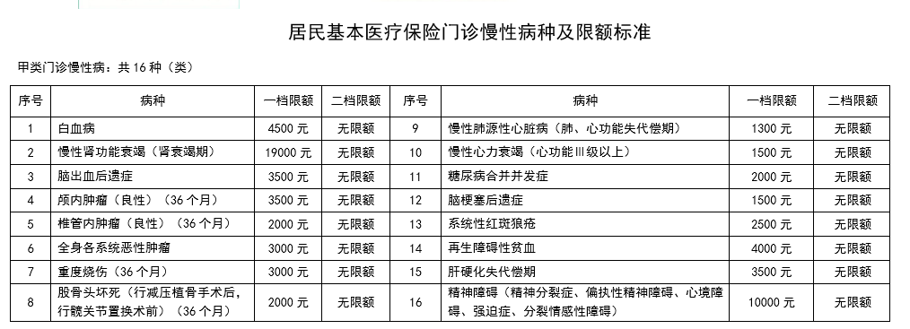 参保大学生中的门诊慢性病患者在协议定点医疗机构发生的符合规定的门诊医疗费用,起付标准300元以上的部分,甲类门诊慢性病按60%比例支付,乙类门诊慢性病按50%比例支付。慢性肾功能衰竭(肾衰竭期)血液透析费用、腹膜透析费用及器官移植后服用环胞素A的费用,其支付比例再提高10%。甲类门诊慢性病的门诊支付待遇,不设年(或有效期)支付限额,乙类门诊慢性病的门诊支付待遇,设起付线并按缴费档次和病种,分别设不同的年(或有效期)支付限额。具体门诊慢性病种及限额标准见附表。