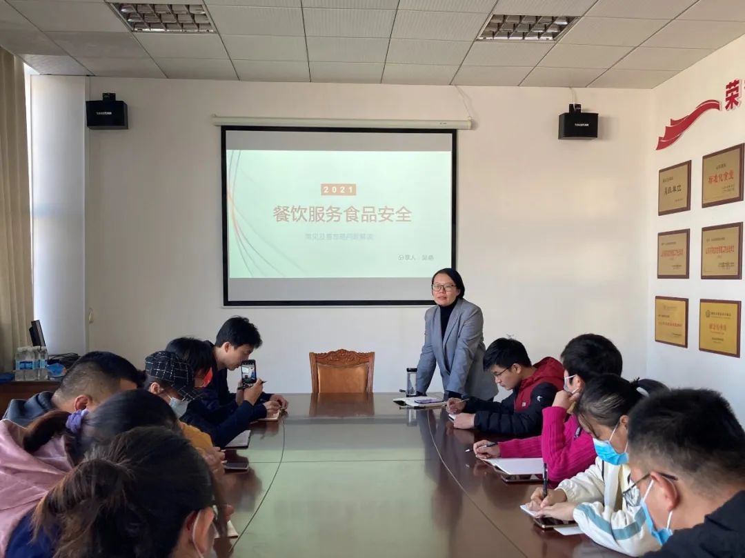 2021年10月27日,我校食堂于饮食服务中心会议室召开全体委托经营公司经理会议,邀请安徽众安食品安全第三方监管公司总经理吴燕女士为到场人员现场培训食品安全管理。
