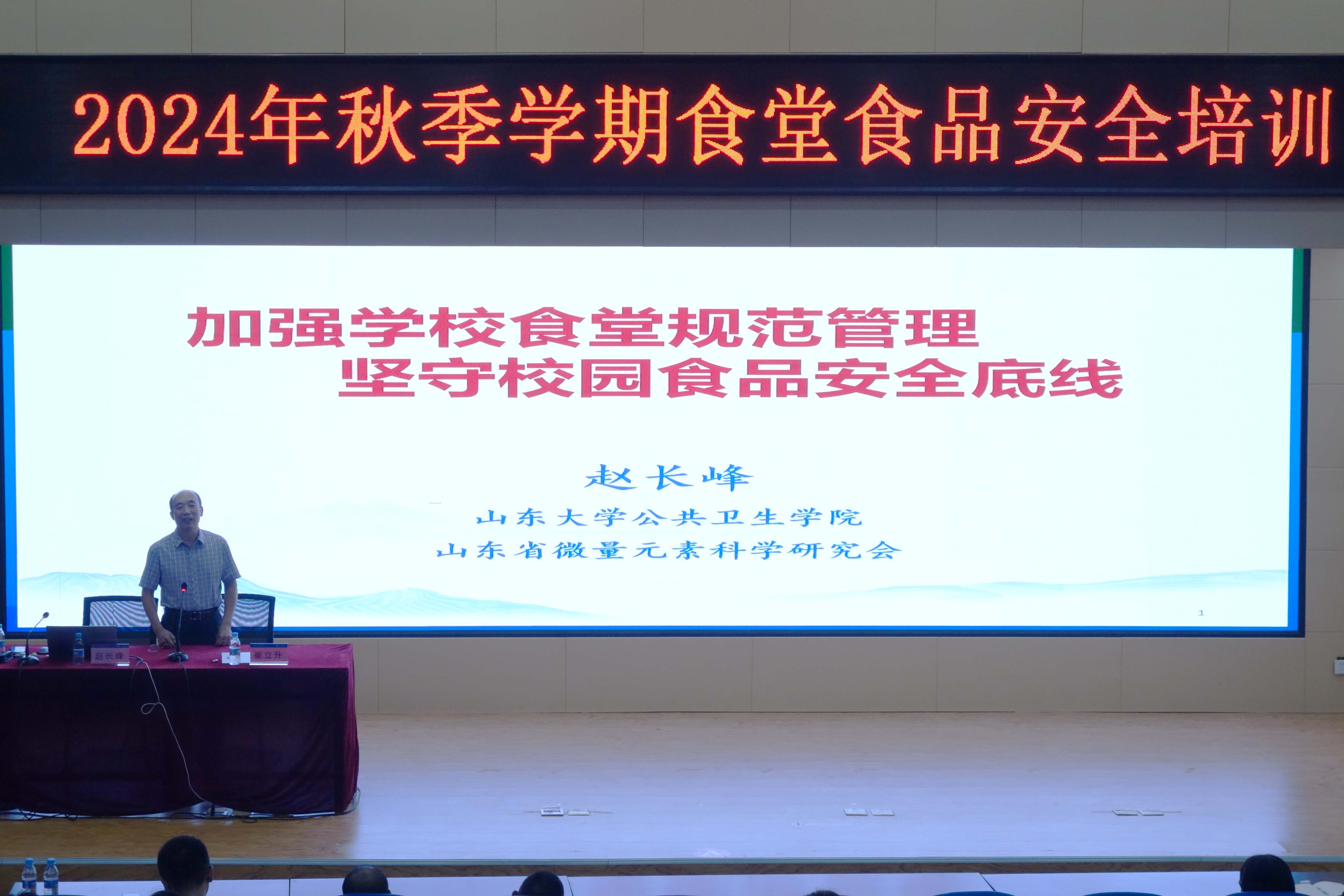 此次培训主讲人为山东大学公共卫生学院赵长峰教授,培训主题为“加强学校食堂规范管理·坚守校园食品安全底线”,培训内容包括学校食堂管理规范及案例分析、校园食品安全排查整治专项行动实施方案解析两大部分。赵教授就学校食堂餐饮服务中的原材料采购、食品贮存、加工制作、备餐、留样等重点环节,以及食品安全管理进行了规范化培训,并结合近期案例进行了风险隐患分析。整场培训历时两个多小时,培训内容丰富、实用,赢得了在场人员的阵阵掌声。